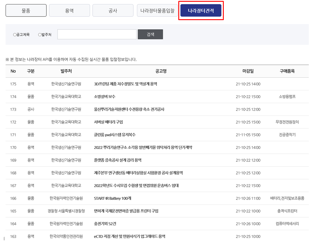 스타빌은 나라장터 API 및 로봇/AI기술을 적용하여, 자체 전자조달시스템을 운영하는 17개 공공기관과 나라장터 물품입찰정보,